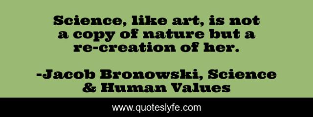 This page presents the quote "Science, like art, is not a copy of nature but a re-creation of her.". Author of this quote is Jacob Bronowski, Science & Human Values. This quote is about science, art, nature,.