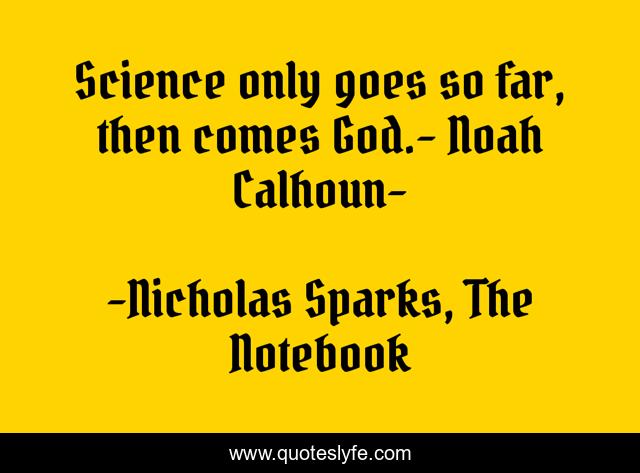This page presents the quote "Science only goes so far, then comes God.- Noah Calhoun-". Author of this quote is Nicholas Sparks, The Notebook. This quote is about faith, science,.