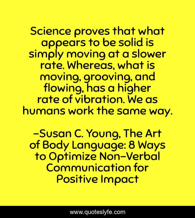 This page presents the quote "Science proves that what appears to be solid is simply moving at a slower rate. Whereas, what is moving, grooving, and flowing, has a higher rate of vibration. We as humans work the same way.". Author of this quote is Susan C. Young, The Art of Body Language: 8 Ways to Optimize Non-Verbal Communication for Positive Impact. This quote is about relationship, communication-skills, body-language, quotes-by-susan-c-young, behaviour, attitude, motivational-speaker-susan-young, energy, mindset,.