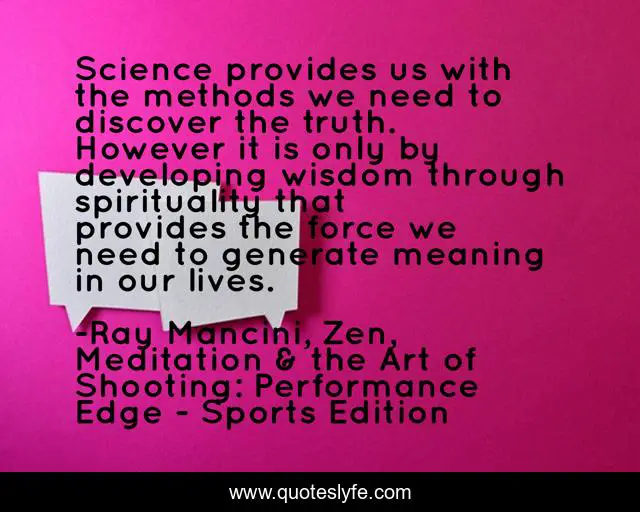 This page presents the quote "Science provides us with the methods we need to discover the truth. However it is only by developing wisdom through spirituality that provides the force we need to generate meaning in our lives.". Author of this quote is Ray Mancini, Zen, Meditation & the Art of Shooting: Performance Edge - Sports Edition. This quote is about developing, science, spirituality, meaning, wisdome, meaning-of-life,.
