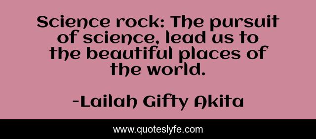 This page presents the quote "Science rock: The pursuit of science, lead us to the beautiful places of the world.". Author of this quote is Lailah Gifty Akita. This quote is about beautiful-and-true, place-of-the-world, traveling-alone, places, geography, travel, travel-writing, travels, beautiful-writing,.