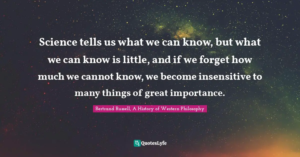 This page presents the quote "Science tells us what we can know, but what we can know is little, and if we forget how much we cannot know, we become insensitive to many things of great importance.". Author of this quote is Bertrand Russell, A History of Western Philosophy. .