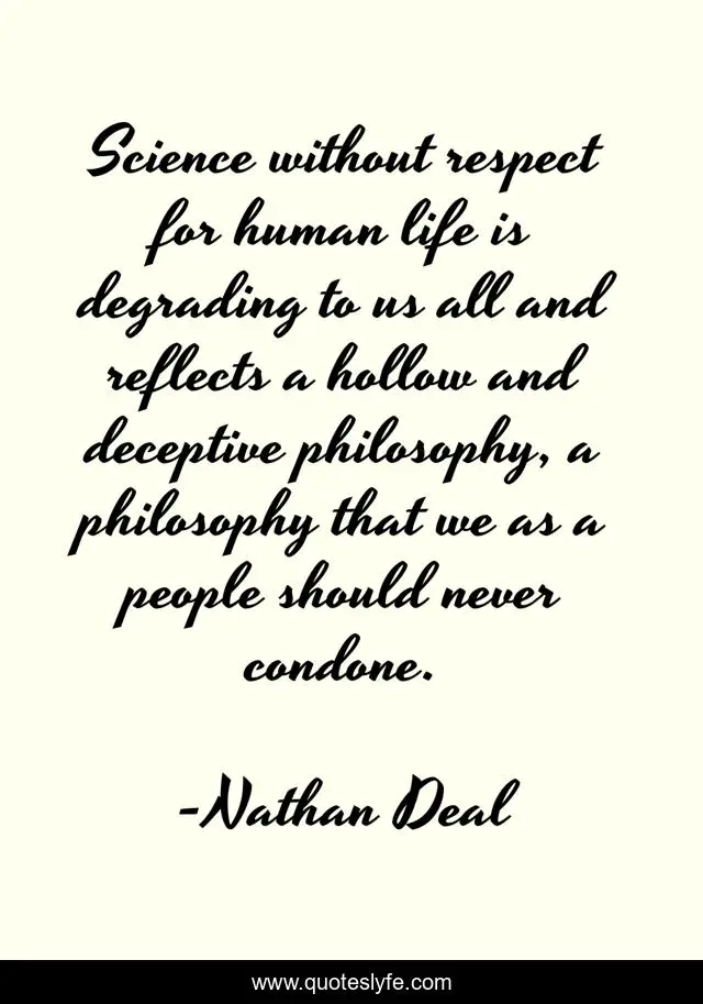 This page presents the quote "Science without respect for human life is degrading to us all and reflects a hollow and deceptive philosophy, a philosophy that we as a people should never condone.". Author of this quote is Nathan Deal. This quote is about science, life, philosophy,.