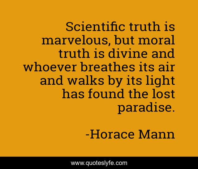 This page presents the quote "Scientific truth is marvelous, but moral truth is divine and whoever breathes its air and walks by its light has found the lost paradise.". Author of this quote is Horace Mann. This quote is about light, truth is, lost,.