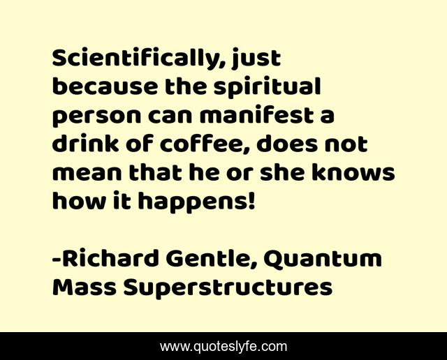This page presents the quote "Scientifically, just because the spiritual person can manifest a drink of coffee, does not mean that he or she knows how it happens!". Author of this quote is Richard Gentle, Quantum Mass Superstructures. This quote is about quantum, qms, richard-gentle, superstructures, metaphysics,.