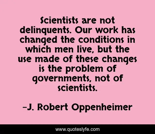 This page presents the quote "Scientists are not delinquents. Our work has changed the conditions in which men live, but the use made of these changes is the problem of governments, not of scientists.". Author of this quote is J. Robert Oppenheimer. This quote is about problem, work, changes,.