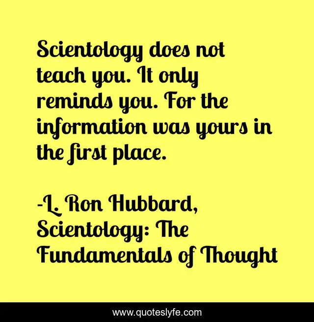 This page presents the quote "Scientology does not teach you. It only reminds you. For the information was yours in the first place.". Author of this quote is L. Ron Hubbard, Scientology: The Fundamentals of Thought. This quote is about religion, scientology, inspirational, enthusiasm,.