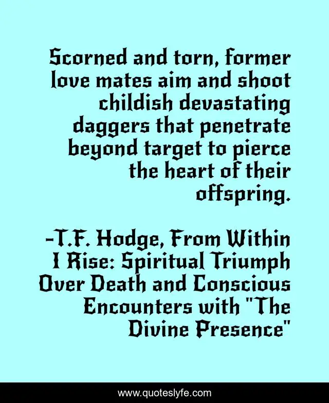 This page presents the quote "Scorned and torn, former love mates aim and shoot childish devastating daggers that penetrate beyond target to pierce the heart of their offspring.". Author of this quote is T.F. Hodge, From Within I Rise: Spiritual Triumph Over Death and Conscious Encounters with "The Divine Presence". This quote is about lovers, families, parent, family, divorce, parenting-children, revenge, emotions, parenting,.