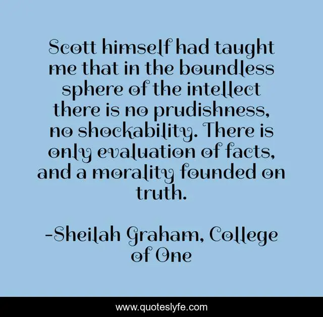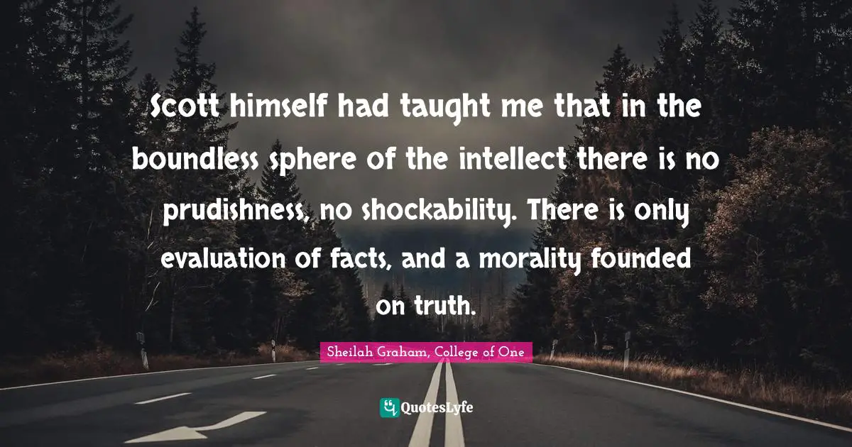 This page presents the quote "Scott himself had taught me that in the boundless sphere of the intellect there is no prudishness, no shockability. There is only evaluation of facts, and a morality founded on truth.". Author of this quote is Sheilah Graham, College of One. This quote is about studying, study, inspirational, enthusiasm, education, evaluation, intellect, fact, morality,.