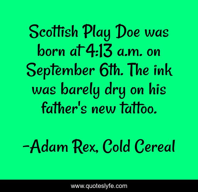 This page presents the quote "Scottish Play Doe was born at 4:13 a.m. on September 6th. The ink was barely dry on his father's new tattoo.". Author of this quote is Adam Rex, Cold Cereal. This quote is about funny, comedy, play-doh, name,.