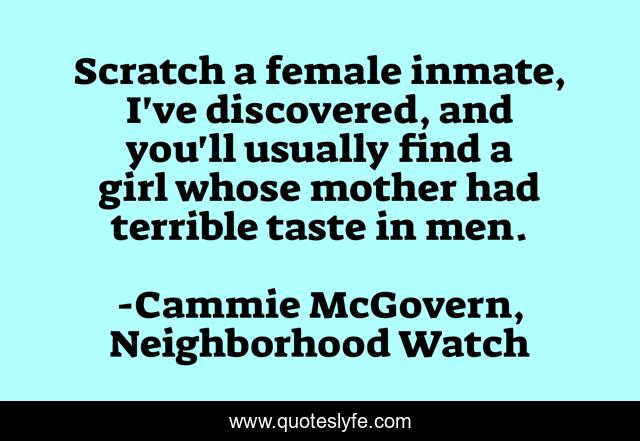 This page presents the quote "Scratch a female inmate, I've discovered, and you'll usually find a girl whose mother had terrible taste in men.". Author of this quote is Cammie McGovern, Neighborhood Watch. This quote is about parenthood, prisons,.