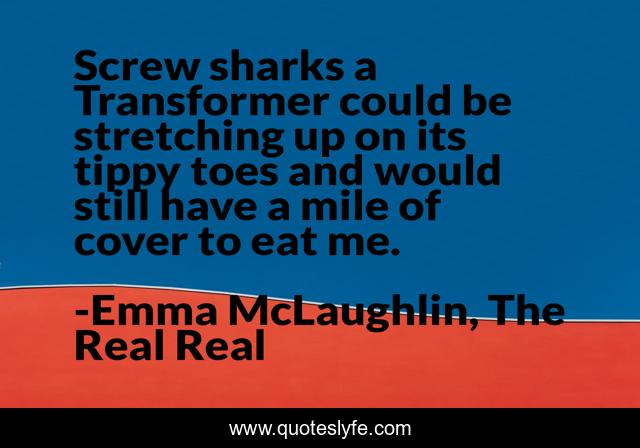 This page presents the quote "Screw sharks a Transformer could be stretching up on its tippy toes and would still have a mile of cover to eat me.". Author of this quote is Emma McLaughlin, The Real Real. This quote is about funny, comedy, ocean,.