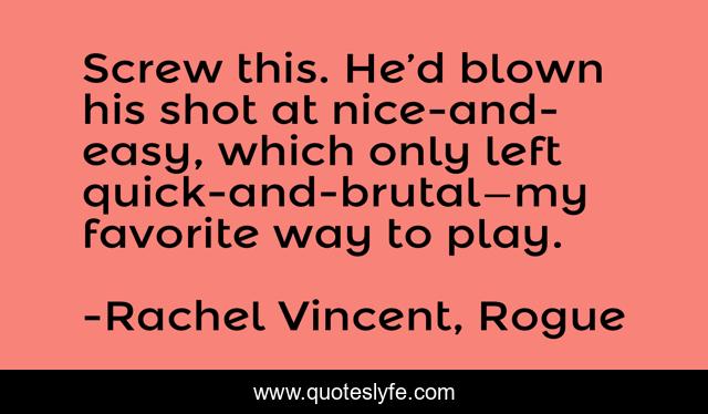 This page presents the quote "Screw this. He’d blown his shot at nice-and-easy, which only left quick-and-brutal—my favorite way to play.". Author of this quote is Rachel Vincent, Rogue. This quote is about funny, comedy,.