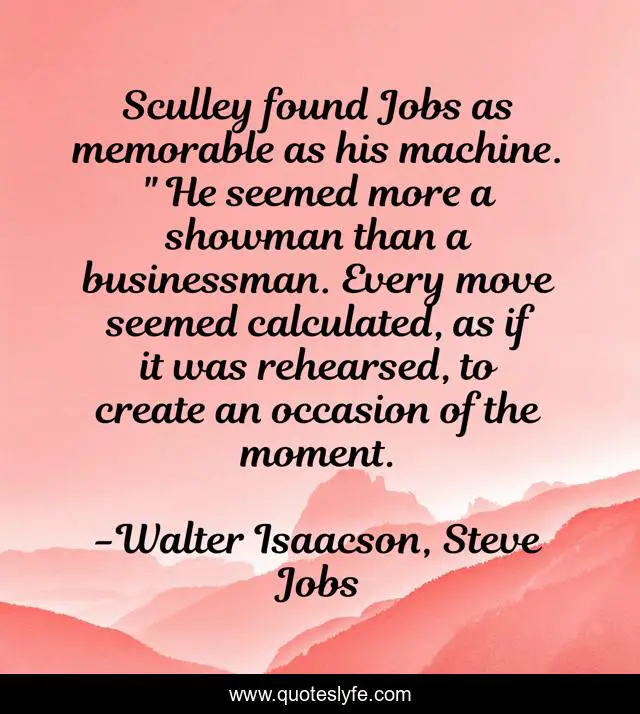 This page presents the quote "Sculley found Jobs as memorable as his machine. " He seemed more a showman than a businessman. Every move seemed calculated, as if it was rehearsed, to create an occasion of the moment.". Author of this quote is Walter Isaacson, Steve Jobs. This quote is about creativity, influence,.