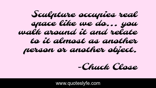 This page presents the quote "Sculpture occupies real space like we do... you walk around it and relate to it almost as another person or another object.". Author of this quote is Chuck Close. This quote is about sculpture, walk,.