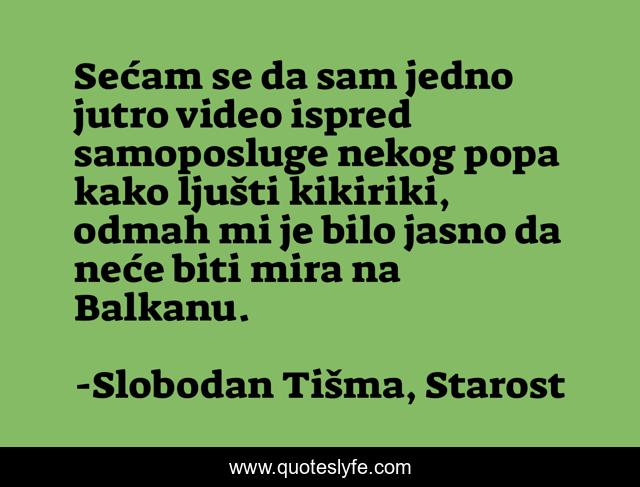 This page presents the quote "Sećam se da sam jedno jutro video ispred samoposluge nekog popa kako ljušti kikiriki, odmah mi je bilo jasno da neće biti mira na Balkanu.". Author of this quote is Slobodan Tišma, Starost. This quote is about religion, priest, war, balkans, church,.