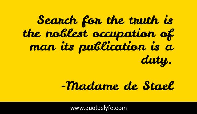 This page presents the quote "Search for the truth is the noblest occupation of man its publication is a duty.". Author of this quote is Madame de Stael. This quote is about search, truth is, man,.