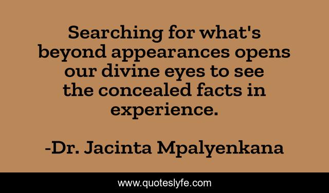 This page presents the quote "Searching for what's beyond appearances opens our divine eyes to see the concealed facts in experience.". Author of this quote is Dr. Jacinta Mpalyenkana. This quote is about inspirational-attitude, inspirational-life, experience-inspiration,.