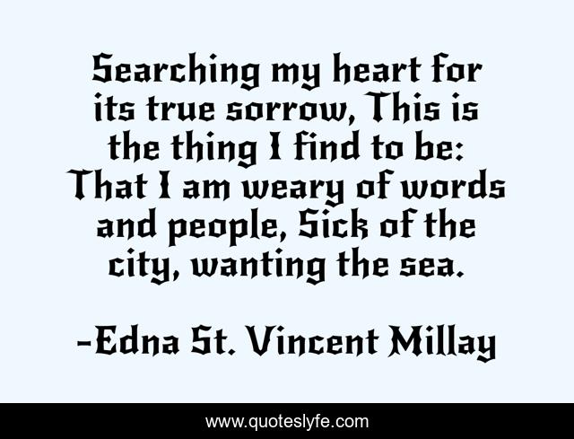 This page presents the quote "Searching my heart for its true sorrow, This is the thing I find to be: That I am weary of words and people, Sick of the city, wanting the sea.". Author of this quote is Edna St. Vincent Millay. This quote is about poetry, sea,.