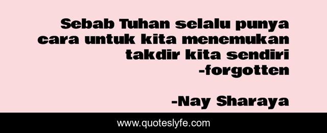This page presents the quote "Sebab Tuhan selalu punya cara untuk kita menemukan takdir kita sendiri -forgotten". Author of this quote is Nay Sharaya. This quote is about romance, teenlit, friendship-and-love,.
