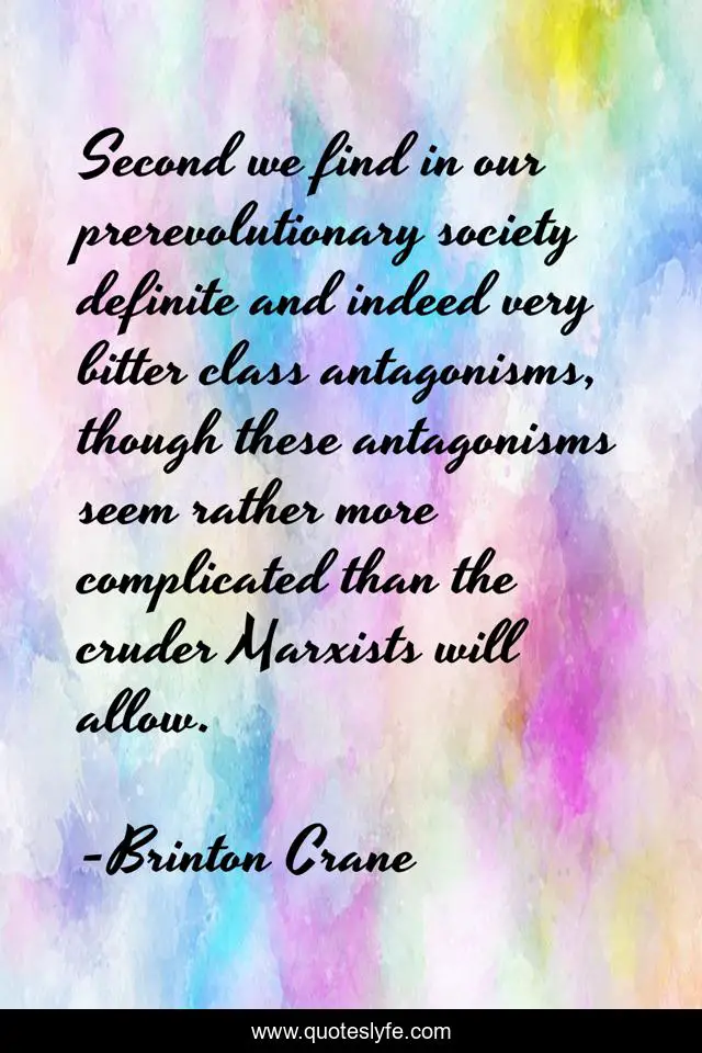 This page presents the quote "Second we find in our prerevolutionary society definite and indeed very bitter class antagonisms, though these antagonisms seem rather more complicated than the cruder Marxists will allow.". Author of this quote is Brinton Crane. .