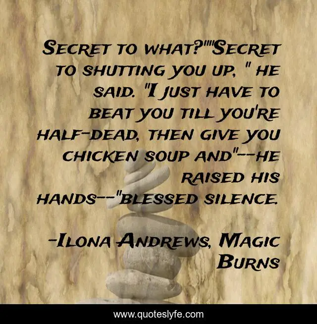 This page presents the quote "Secret to what?""Secret to shutting you up, " he said. "I just have to beat you till you're half-dead, then give you chicken soup and"--he raised his hands--"blessed silence.". Author of this quote is Ilona Andrews, Magic Burns. This quote is about kate-daniels, chicken-soup, magic-burns, ilona-andrews, curran, kate, silence,.