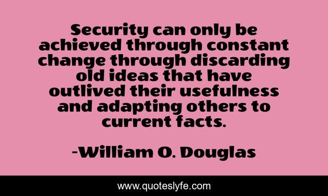This page presents the quote "Security can only be achieved through constant change through discarding old ideas that have outlived their usefulness and adapting others to current facts.". Author of this quote is William O. Douglas. This quote is about positive, confidence, creating, change,.