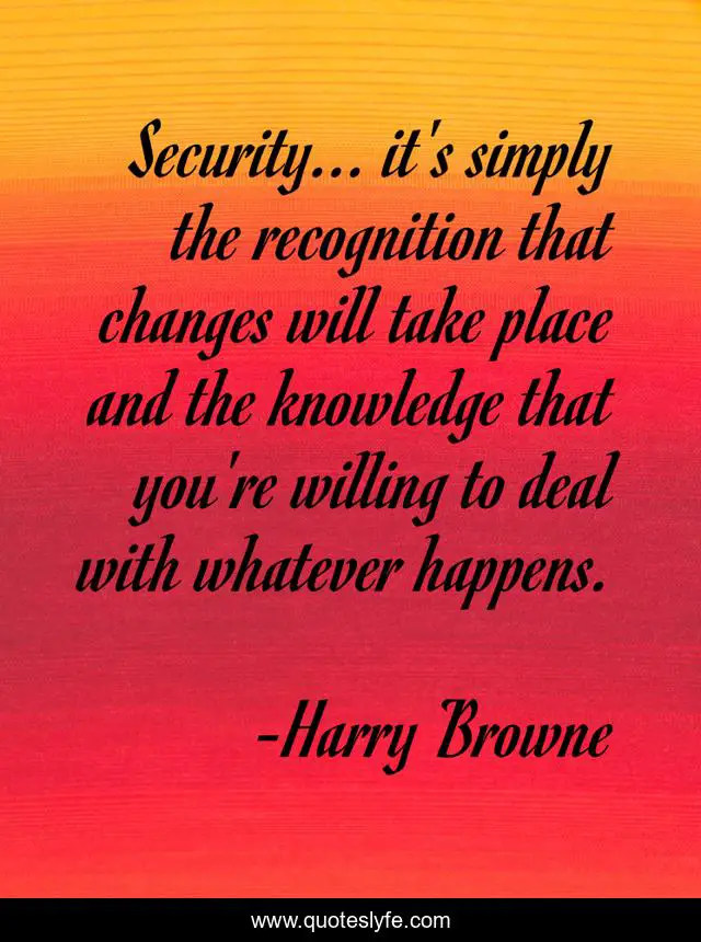 This page presents the quote "Security... it's simply the recognition that changes will take place and the knowledge that you're willing to deal with whatever happens.". Author of this quote is Harry Browne. This quote is about security, changes,.