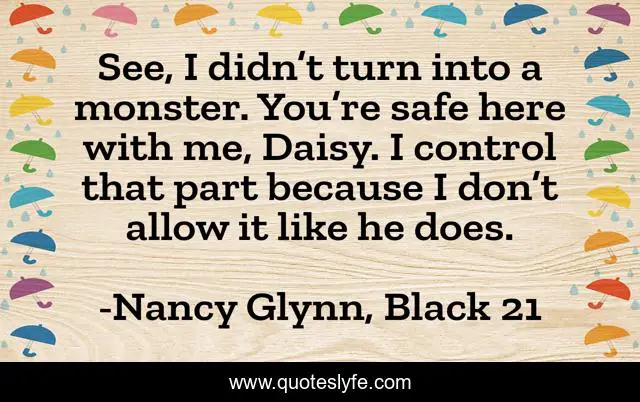 This page presents the quote "See, I didn’t turn into a monster. You’re safe here with me, Daisy. I control that part because I don’t allow it like he does.". Author of this quote is Nancy Glynn, Black 21. This quote is about debut-novel, books, love, paranormal-romance, affection,.
