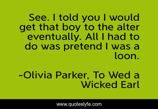 This page presents the quote "See. I told you I would get that boy to the alter eventually. All I had to do was pretend I was a loon.". Author of this quote is Olivia Parker, To Wed a Wicked Earl. This quote is about inspirational-life, humor, love, affection,.