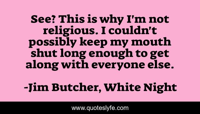 This page presents the quote "See? This is why I'm not religious. I couldn't possibly keep my mouth shut long enough to get along with everyone else.". Author of this quote is Jim Butcher, White Night. This quote is about religion, humor, harry-dresden,.