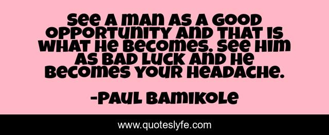This page presents the quote "See a man as a good opportunity and that is what he becomes. See him as bad luck and he becomes your headache.". Author of this quote is Paul Bamikole. This quote is about headache, opportunity, badluck, man,.