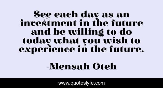 "Mensah Oteh Quotes." Quoteslyfe.com, 2025. Sat. 06 Dec. 2025. <https://www.quoteslyfe.com/quote/See-each-day-as-an-investment-in-49238>.