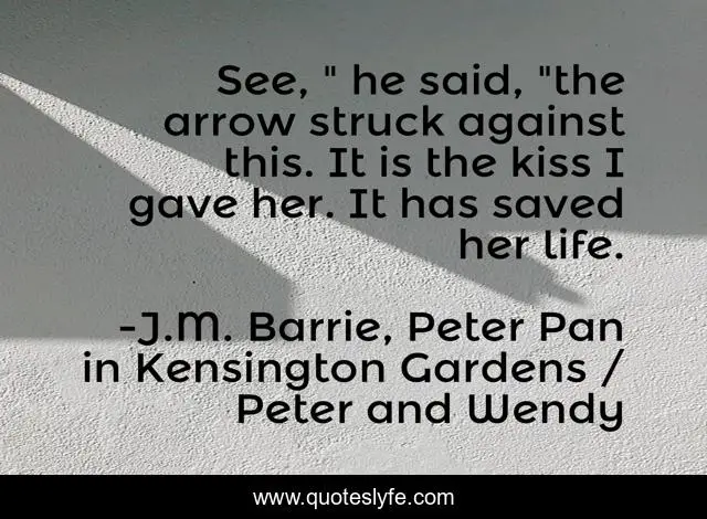 This page presents the quote "See, " he said, "the arrow struck against this. It is the kiss I gave her. It has saved her life.". Author of this quote is J.M. Barrie, Peter Pan in Kensington Gardens / Peter and Wendy. This quote is about kiss, neverland, life-saving, wendy, j-m-barrie, peter-pan,.