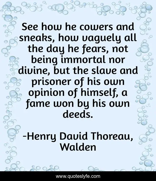 This page presents the quote "See how he cowers and sneaks, how vaguely all the day he fears, not being immortal nor divine, but the slave and prisoner of his own opinion of himself, a fame won by his own deeds.". Author of this quote is Henry David Thoreau, Walden. .