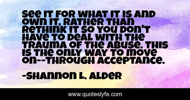 This page presents the quote "See it for what it is and own it, rather than rethink it so you don't have to deal with the trauma of the abuse. This is the only way to move on--through acceptance.". Author of this quote is Shannon L. Alder. This quote is about narcissism, ptsd-recovery, cheating, recovery, supply, acceptance, betrayal, cheating-husbands, devalue,.