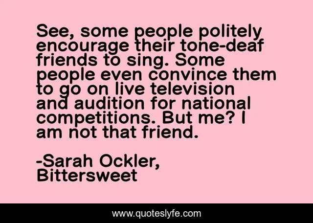 This page presents the quote "See, some people politely encourage their tone-deaf friends to sing. Some people even convince them to go on live television and audition for national competitions. But me? I am not that friend.". Author of this quote is Sarah Ockler, Bittersweet. This quote is about friends, friendship, singing,.