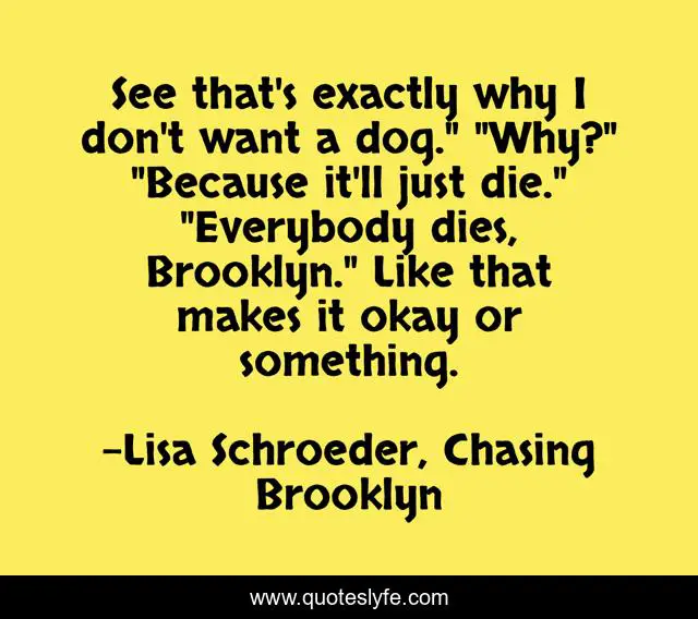 This page presents the quote "See that's exactly why I don't want a dog." "Why?" "Because it'll just die." "Everybody dies, Brooklyn." Like that makes it okay or something.". Author of this quote is Lisa Schroeder, Chasing Brooklyn. This quote is about grief, moving-on, pets,.