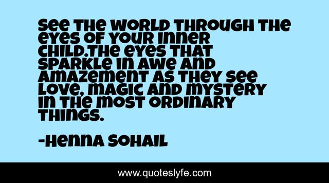 This page presents the quote "See the world through the eyes of your inner child.The eyes that sparkle in awe and amazement as they see love, magic and mystery in the most ordinary things.". Author of this quote is Henna Sohail. This quote is about love, beauty, peace, innocence, behaviour, attitude, contentment, humility, childlike-wonder,.