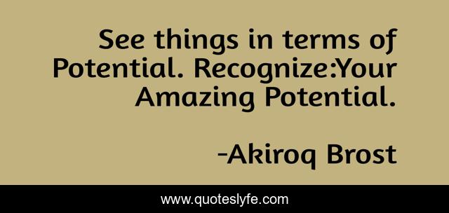 This page presents the quote "See things in terms of Potential. Recognize:Your Amazing Potential.". Author of this quote is Akiroq Brost. This quote is about confidence, believe-in-yourself, motivational, potential, optimistic, positive,.