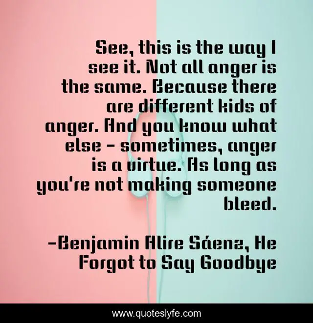 This page presents the quote "See, this is the way I see it. Not all anger is the same. Because there are different kids of anger. And you know what else - sometimes, anger is a virtue. As long as you're not making someone bleed.". Author of this quote is Benjamin Alire Sáenz, He Forgot to Say Goodbye. .