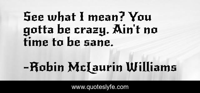 This page presents the quote "See what I mean? You gotta be crazy. Ain't no time to be sane.". Author of this quote is Robin McLaurin Williams. This quote is about sanity, life, humor, insanity,.