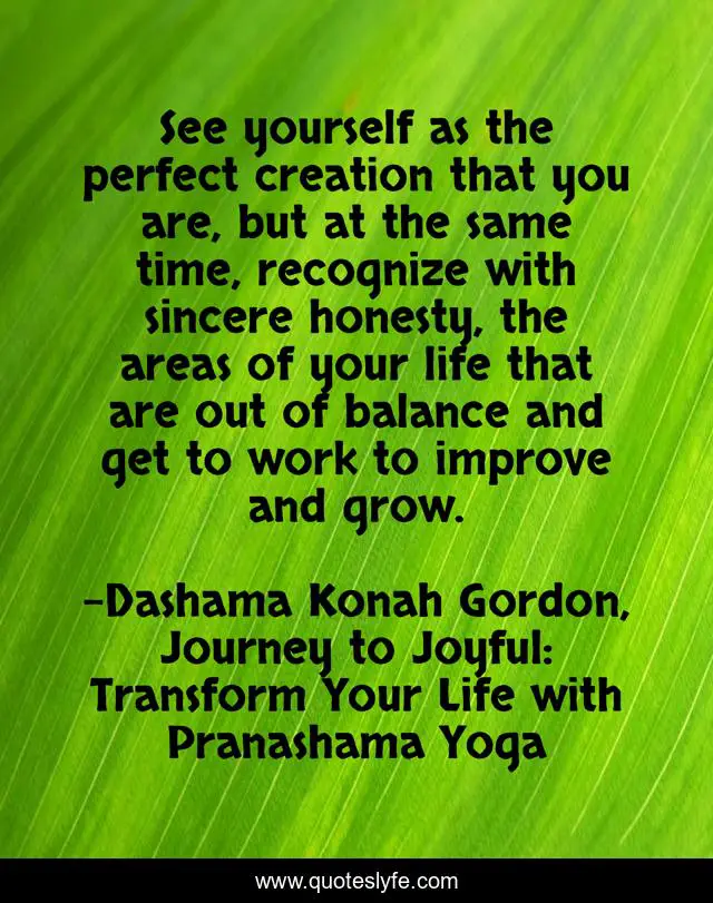 This page presents the quote "See yourself as the perfect creation that you are, but at the same time, recognize with sincere honesty, the areas of your life that are out of balance and get to work to improve and grow.". Author of this quote is Dashama Konah Gordon, Journey to Joyful: Transform Your Life with Pranashama Yoga. This quote is about love, happiness, inspirational, enthusiasm, yoga, affection,.