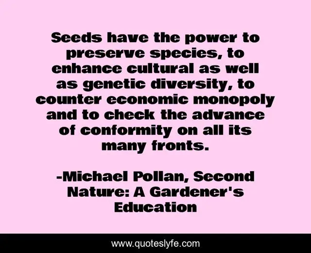 This page presents the quote "Seeds have the power to preserve species, to enhance cultural as well as genetic diversity, to counter economic monopoly and to check the advance of conformity on all its many fronts.". Author of this quote is Michael Pollan, Second Nature: A Gardener's Education. This quote is about diversity, garden, nature, preservation, seeds, gardening, nonconformity,.