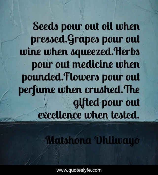 "Matshona Dhliwayo Quotes." Quoteslyfe.com, 2025. Sat. 06 Dec. 2025. <https://www.quoteslyfe.com/quote/Seeds-pour-out-oil-when-pressed-Grapes-280316>.