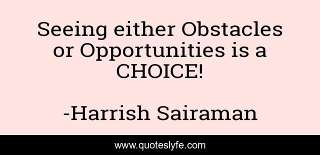 This page presents the quote "Seeing either Obstacles or Opportunities is a CHOICE!". Author of this quote is Harrish Sairaman. This quote is about confidence, positive, motivational, optimistic, inspirational, enthusiasm,.
