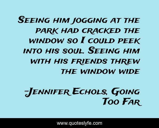 This page presents the quote "Seeing him jogging at the park had cracked the window so I could peek into his soul. Seeing him with his friends threw the window wide". Author of this quote is Jennifer Echols, Going Too Far. This quote is about boys, friends, humor, teenagers,.