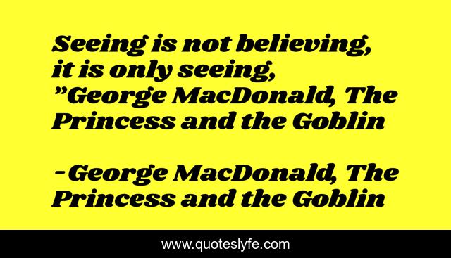 This page presents the quote "Seeing is not believing, it is only seeing, ”George MacDonald, The Princess and the Goblin". Author of this quote is George MacDonald, The Princess and the Goblin. This quote is about mystical, spiritual, little-people, childrens-book, elemental-kingdom, faerie, fairy-tales, inspirational, universal-law,.