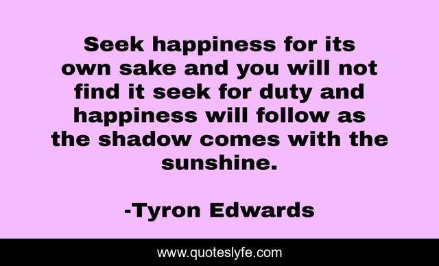 This page presents the quote "Seek happiness for its own sake and you will not find it seek for duty and happiness will follow as the shadow comes with the sunshine.". Author of this quote is Tyron Edwards. .