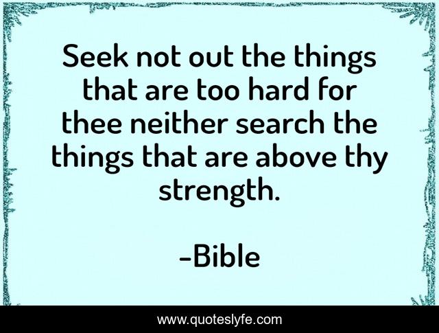 This page presents the quote "Seek not out the things that are too hard for thee neither search the things that are above thy strength.". Author of this quote is Bible. .